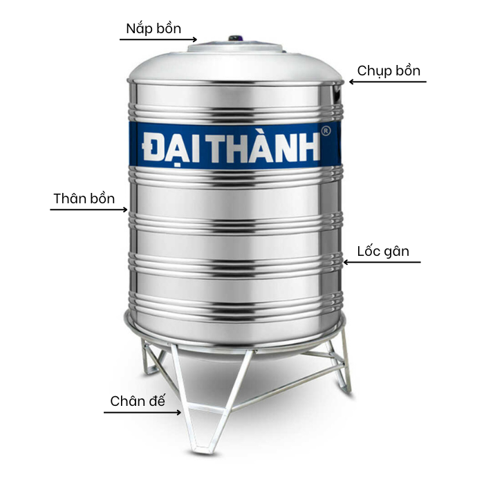 Nắp bồn: Nằm trên nóc bồn, có tác dụng che chắn bồn nước, tránh ánh sáng mặt trời chiếu vào, tạo rong rêu ở phía bên trong thân bồn, tránh gây tắc nghẽn đường ống và giúp đảm bảo vệ sinh. Nắp bồn Đại Thành được làm từ chất liệu inox SUS 304, có độ bền cao, chống ăn mòn và chịu lực tốt.