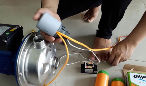 - Bước 4: Hoàn thiện hệ thống bằng cách lắp chân điện cực của máy bơm vào ổ cắm đã đấu qua phao điện.