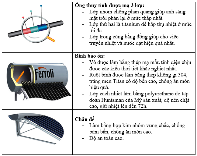 - Sự khác biệt lớn nhất so với các dòng ống thủy tinh chân không cùng loại là ống thủy tinh của máy Ferroli có thể hấp thụ năng lượng của tia hồng ngoại. Vì vậy mà những ngày mưa, trong máy vẫn có nước nóng để sử dụng.